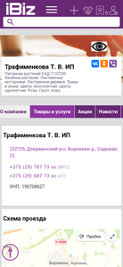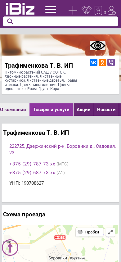 | AI-анализ | The portal Sad7sotok.ibiz.by is an online business representing Trafimenkova T.V. IP, a plant nursery named SAD 7 SOTOK. The nursery specializes in various types of plants, including conifers, deciduous shrubs, deciduous trees, grasses and herbs, flowers, perennials, and roses. The website provides information about the company's products, such as seeds, seedlings, and planting materials, as well as company news, announcements, vacancies, and customer reviews on social media platforms like VKontakte and Odnoklassniki. The contact information includes two phone numbers for MTS and A1 networks, and the company's location is in Dzerzhinsky district, Boroviki street, Saдоваia, number 23. The business hours are from 9: |