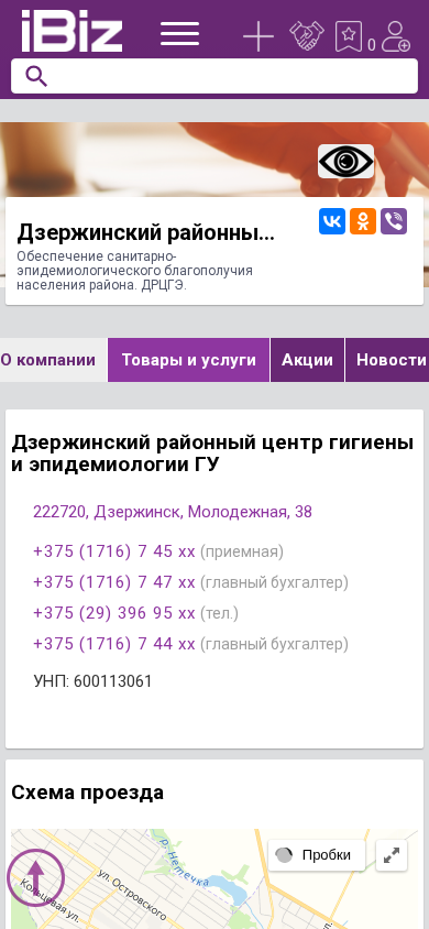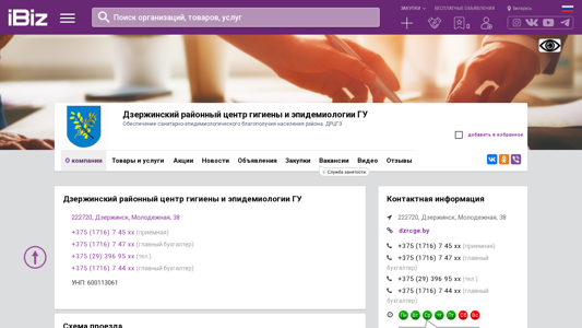 | AI-анализ | This online resource represents the Dzerzhinsky District Center for Hygiene and Epidemiology under the GU for the provision of sanitary-epidemiological well-being of the district population. The website provides contact information, address, and a map for reaching the center located at Mолодежная 38, Dzerzhinsk, 222720, Belarus. The website also includes sections for company information, products and services, news, announcements, vacancies, videos, and reviews. The contact numbers provided are +375 (1716) 7 45 xx (reception), +375 (1716) 7 47 xx (chief accountant), +375 (29) 396 95 xx (tel.), and +375 (171 |