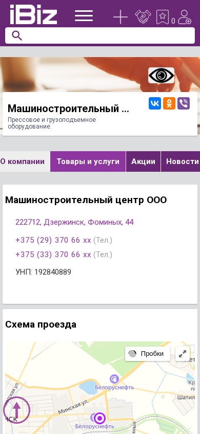 The portal is a business-to-business marketplace for purchasing and selling machinery and equipment, specifically press and lifting equipment, located in Dzerzhinsk, Belarus, at the address Фоминых, 44. The website provides a scheme for reaching the company, as well as contact information, including phone numbers +375 (29) 370 66 xx and +375 (33) 370 66 xx. The company's UNP number is 192840889. The portal offers various categories such as machinery and equipment, lifting equipment, and other related products and services. Users can create their own cards, view statistics, and contact the company directly. The company operates from Monday to Friday, 9:00 AM to 6:00 PM, without breaks for lunch. The portal is part of