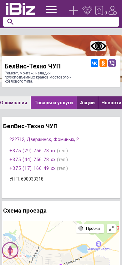 | AI-анализ | The web project "BelVis-Techno CHUP" offers repair, installation, and adjustment services for heavy-duty overhead and telescopic cranes in Dzerzhinsk, Belarus. The company's address is Фоминых, 2 in the 222712 postal code area. The phone numbers provided for contact are +375 (29) 756 78 xx, +375 (44) 756 78 xx, and +375 (17) 166 49 xx. The UNP number is 690033318. The company operates Monday through Friday from 10:00 to 18:00 without lunch breaks. Services offered include lifting equipment and lifts. |
