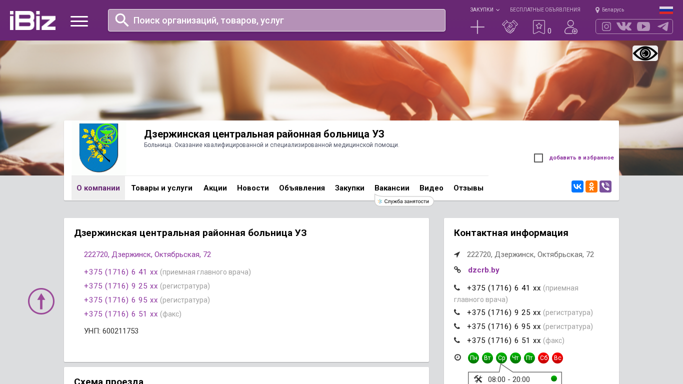 | SEO-описание | Дзержинская центральная районная больница УЗ - Больница. Оказание квалифицированной и специализированной медицинской помощи.. Схема проезда, контактные телефоны, адрес компании Дзержинская центральная районная больница УЗ. 222720, Дзержинск, , Октябрьская, 72 |