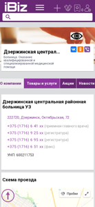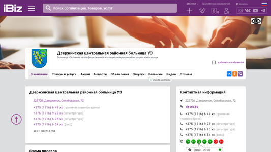 | AI-анализ | This online resource is dedicated to the Dzerzhinsk Central District Hospital (Дзержинская центральная районная больница УЗ) in Belarus. The website provides information on the hospital's location, contacts, and qualified and specialized medical services. The address is given as 222720, Dzerzhinsk, October Street, 72. The hospital offers various medical services and treatments. Visitors can find contact information for the reception of the chief doctor, as well as for the registration desk and fax number. The hospital's Unified State Register number is 600211753. The website also includes a map for directions, conditions of use, and other relevant information. The opening hours are given as Monday to Friday from 8:00 to 20:00 without lunch breaks, and Saturdays and Sundays are closed |