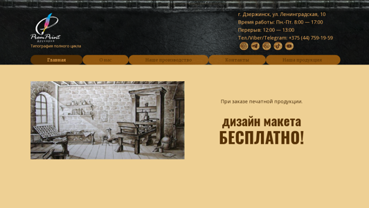 | AI-анализ | This website is a printing company located in Dzerzhinsk, Belarus, at ul. Leninградskaya 10. The business operates from Monday to Friday, 8:00 to 17:00, with a lunch break from 12:00 to 13:00. Contact information includes a phone number, Viber, and Telegram handle, all listed as +375 (44) 759-19-59. The company offers a full range of printing services, from business cards to custom packaging in gofrocardona, and operates in the areas of offset printing, banner production, and the creation of custom tablets. Customers can submit designs for free, and the company offers a variety of discounts. The printing process takes between 5 to 14 working days, depending on the complexity and size of the |