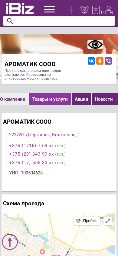 | AI-анализ | The web project "АРОМАТИК СООО" is a Belarusian company located in Dzerzhinsk, producing various types of extracts and spirit-containing products. The company's address is Колхозная 1. The contact information includes three phone numbers: +375 (1716) 7 69 xx, +375 (29) 343 99 xx, and +375 (17) 555 33 xx. The business operates from Monday to Friday, 09:00 to 18:00, without lunch breaks. The website provides information on their products and services, as well as contact details and a map for visitors. The company is listed under the "Produkty pitania" (food products) category in the Yandex |
