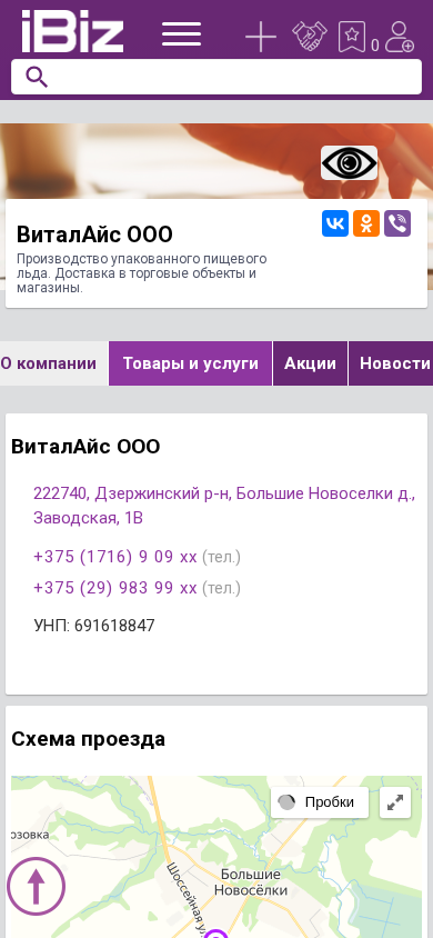| Название / Заголовок | ВиталАйс ООО - Производство упакованного пищевого льда. Доставка в торговые объекты и магазины.. 222740, , Большие Новоселки д., Заводская, 1В |