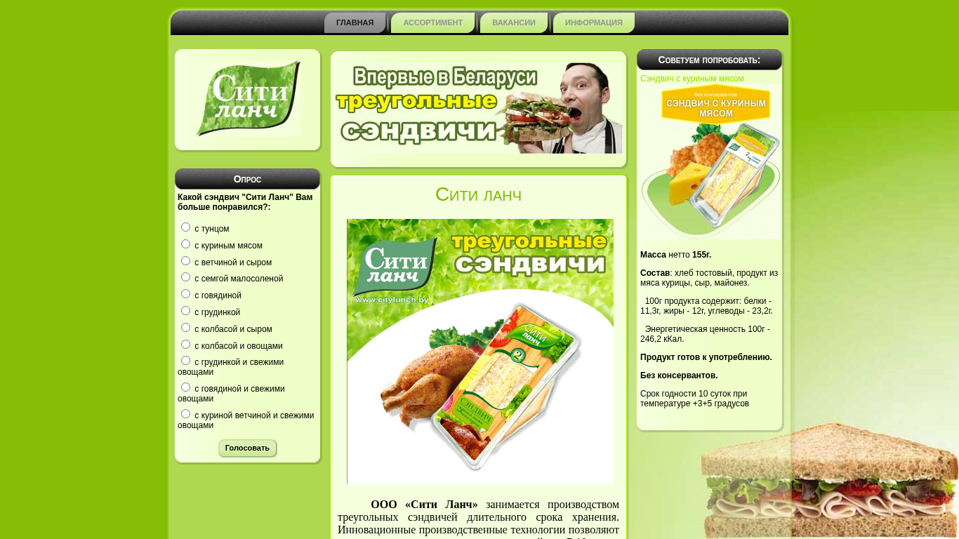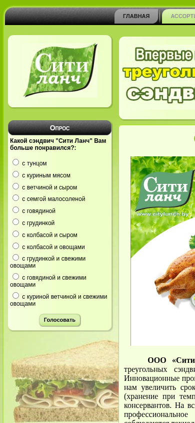 | AI-анализ | This website, titled "citylunch.by" and described as "Всегда свежий вкус!", is a Belarusian business specializing in the production and sale of long-lasting triangular sandwiches. The company employs innovative production technologies that enable a shelf life of 7-10 days without the use of preservatives, at temperatures between +2 and +6°C. All stages of production use professional kitchen equipment and adhere to strict technological processes and temperature regimes. Sandwiches are ready to consume without additional processing. The products are exclusively made with Belarusian ingredients to avoid price fluctuations based on currency rates, expanding the range of Belarusian-made goods. The sandwiches are available at railway and bus stations, cafeterias, and casinos. They are widely represented in vending machine networks in major Minsk universities and shopping centers. The |