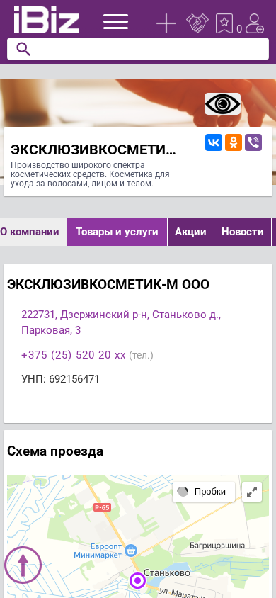 This online resource is a business website for ЭКСКЛЮЗИВКОСМЕТИК-М ООО, a company based in Belarus, specifically located at Парковая, 3, Станьково д., 222731, Dzerzhinsk district. The site primarily offers information about the company's production of a wide range of cosmetic products for hair, face, and body care. The contact information, including a phone number, is provided for inquiries. The site also includes sections for company information, products and services, news, and vacancies. The domain is registered under the .BY extension and falls under the categories of Cosmetics and Parfumeria in the Yandex Business Directory.