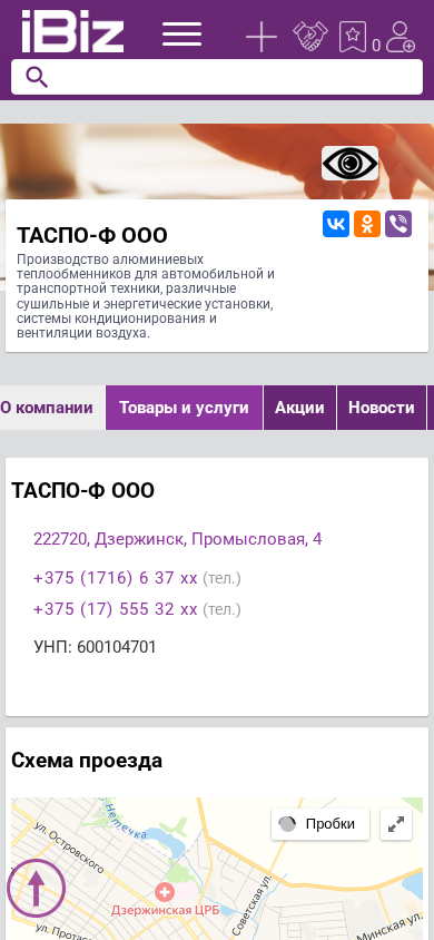 | AI-анализ | This website is the official online presence of TASPO-F OOO, a Belarusian manufacturing company based in Dzerzhinsk. The company specializes in the production of aluminum heat exchangers for automotive and transportation industries, as well as various drying and energy systems, and air conditioning and ventilation systems. The website provides information on the company's products and services, contact details, and a map for visitors. The main categories of the website include ventilation and air conditioning, as well as other related categories. The website also features a section for news and announcements, job vacancies, and customer reviews on social media platforms. The contact information for TASPO-F OOO includes two phone numbers and the company's UNP (Unified State Register of Enterprises) number. The website is operated by OOO "AIBIZ MEDIA," the Belarusian business |