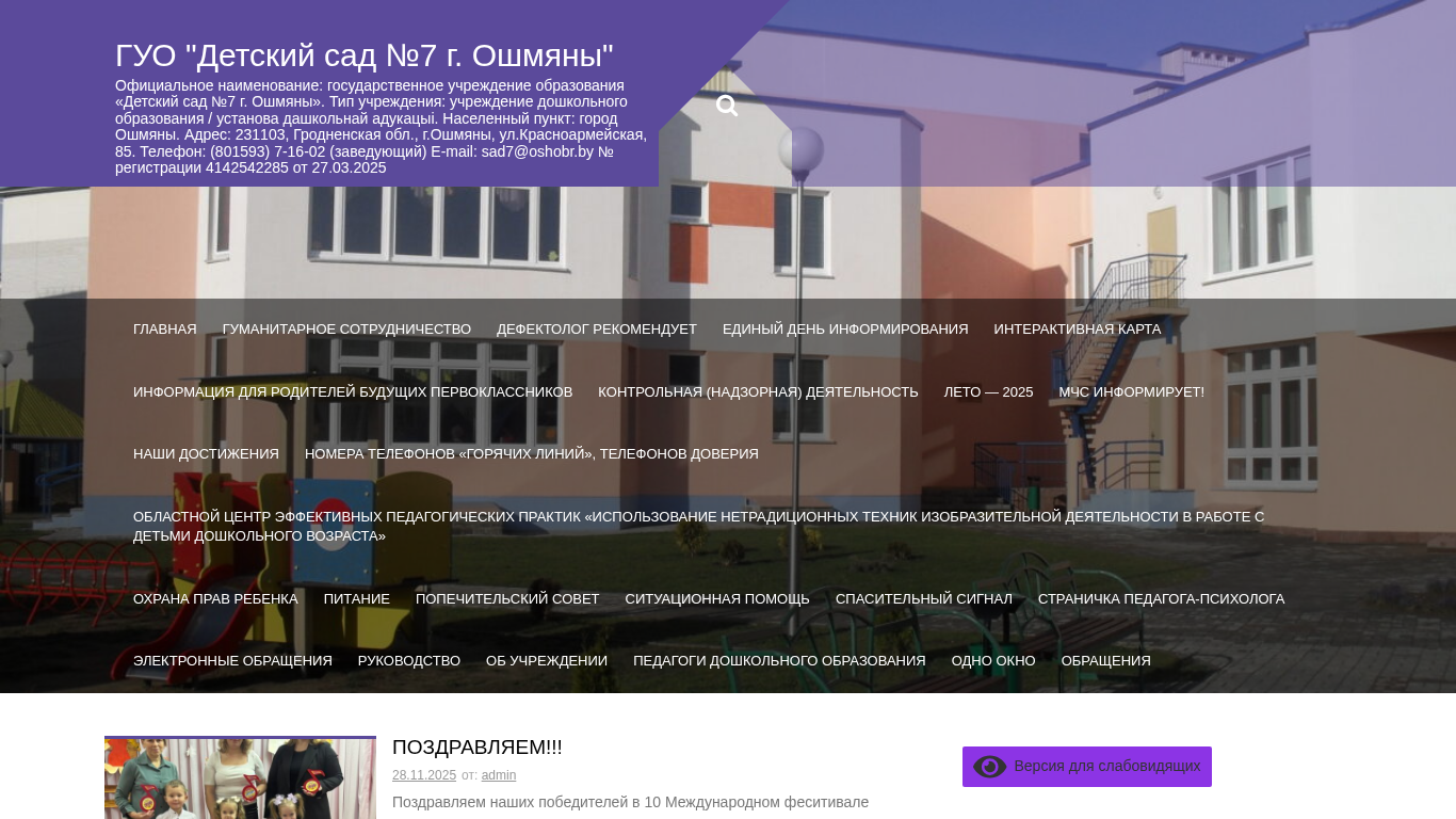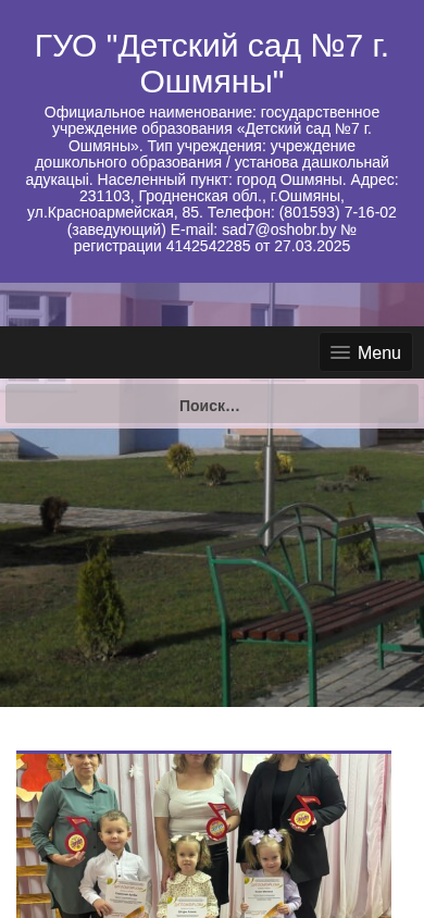 | Название / Заголовок | ГУО "Детский сад №7 г. Ошмяны" — Официальное наименование: государственное учреждение образования «Детский сад №7 г. Ошмяны». Тип учреждения: учреждение дошкольного образования / установа дашкольнай адукацыі. Населенный пункт: город Ошмяны. Адрес: 231103, Гродненская обл., г.Ошмяны, ул.Красноармейская, 85. Телефон: (801593) 7-16-02 (заведующий) E-mail: sad7@oshobr.by № регистрации 4142542285 от 27.03.2025 |