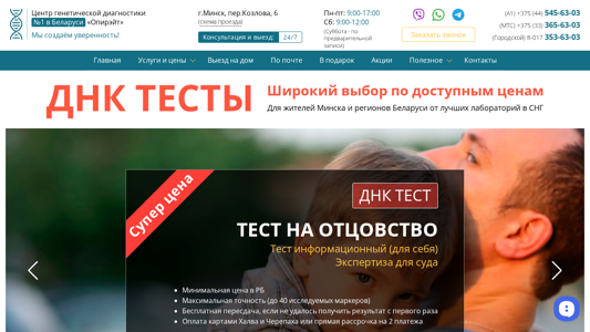 | SEO-описание | Тесты ДНК в Минске и Беларуси сделать легко. Широкий выбор по низкой стоимости. Узнавай сколько стоит нужный анализ ДНК. Консультация, подбор и доставка бесплатно. Лучшая цена на ДНК тест отцовство, родство, генетический паспорт и др. |