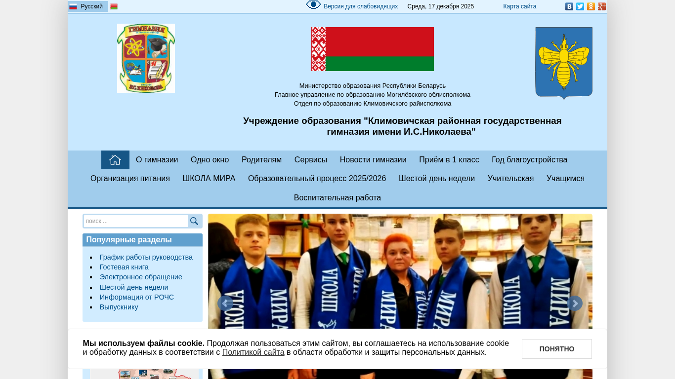 | AI-анализ | The website is for Klimovichskaya Gimnaziya (Klimovich Regional State Gimnazia named after I.S.Nikolaev), an educational institution in Belarus. The website contains information about the school, its history, structure, academic offerings, and extracurricular activities. The keywords include 'gymnasiums', 'read more', 'education', 'portal', 'news', 'jobs', 'school site', 'republic', 'pupils', 'Belarus', 'educational institutions', 'assessments', 'organizations', and 'Klimovich gimnazia'. The school's logo and anthem are also featured. The website is accredited by the Ministry of Education in the Republic of Belarus. Visitors can find information on the school's schedule, subjects offered, and rules |