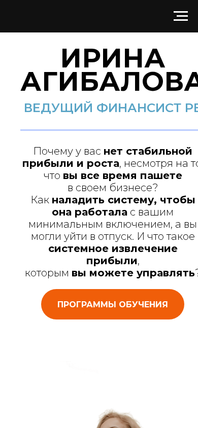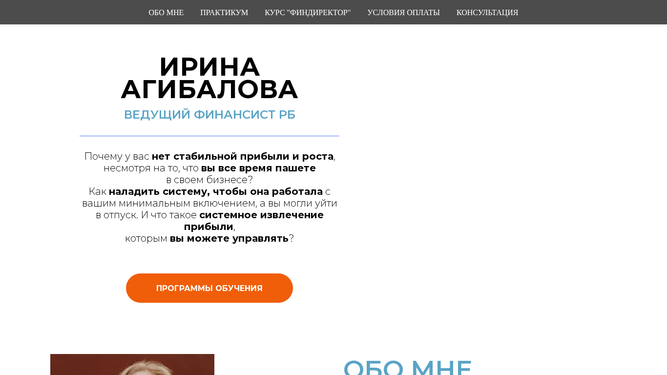 | AI-анализ | The website "agibalova.by" is a business consulting platform owned by Irina Agibalova, a leading financial expert with over 25 years of experience. The website offers three main educational programs for business owners, top executives, freelancers, experts, entrepreneurs, and financiers at various levels. These programs include "Constructor of Profit," a system for extracting profit; "Constructor of Business Scaling," a program for scaling businesses; and "Million Dollar Director," a course on business foundation. Agibalova is also a certified business trainer and monetization expert, known for her unconventional marketing approach based on digitalization. The website includes information about her background, clients' turnover exceeding $790 million, and her experience in various industries. The programs cover topics such as increasing average check size, attracting clients without additional advertising costs, and building a competitive |