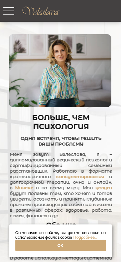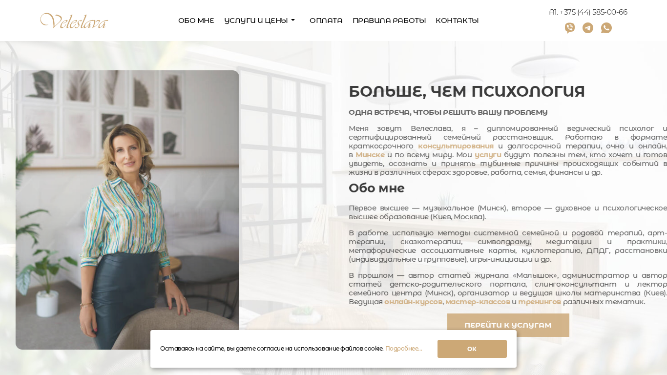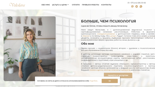 The portal veleslava.by is a family psychology and counseling service based in Minsk, Belarus, offering consultations, therapy, conflict resolution in couples, and solutions to family problems. The website also provides seminars, trainings, and master-classes. It operates as a private practice. The keywords related to the website include 'works', 'Minsk', '375', '585-00-66', 'confidentiality', 'me', 'contacts', 'without', 'trainings', 'only', 'so that you may', 'Veleslava', 'troubles', 'whom I agree to', 'policy', '693285006', 'online'. The website offers individual and group consultations, online seminars, and trainings using various therapeutic methods such as systemic family and generational therapy