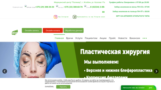 The website is for the Multiprofile Medical Center "Polymed" located in the city of Zhobin, Belarus. It offers modern diagnostic and treatment equipment and services provided by first-category doctors. Users can contact the center at the provided phone numbers: +375 (29) 388-30-30, +375 (33) 388-60-70, and 8 (02334) 3-88-88. The website also has an Instagram account and a Telegram channel for users to subscribe. The center's operating hours are from 7:00 AM to 8:00 PM for blood tests from a vein, and from 8:00 AM to 6:00 PM for blood tests from a finger. Services offered include MRIs, online registration