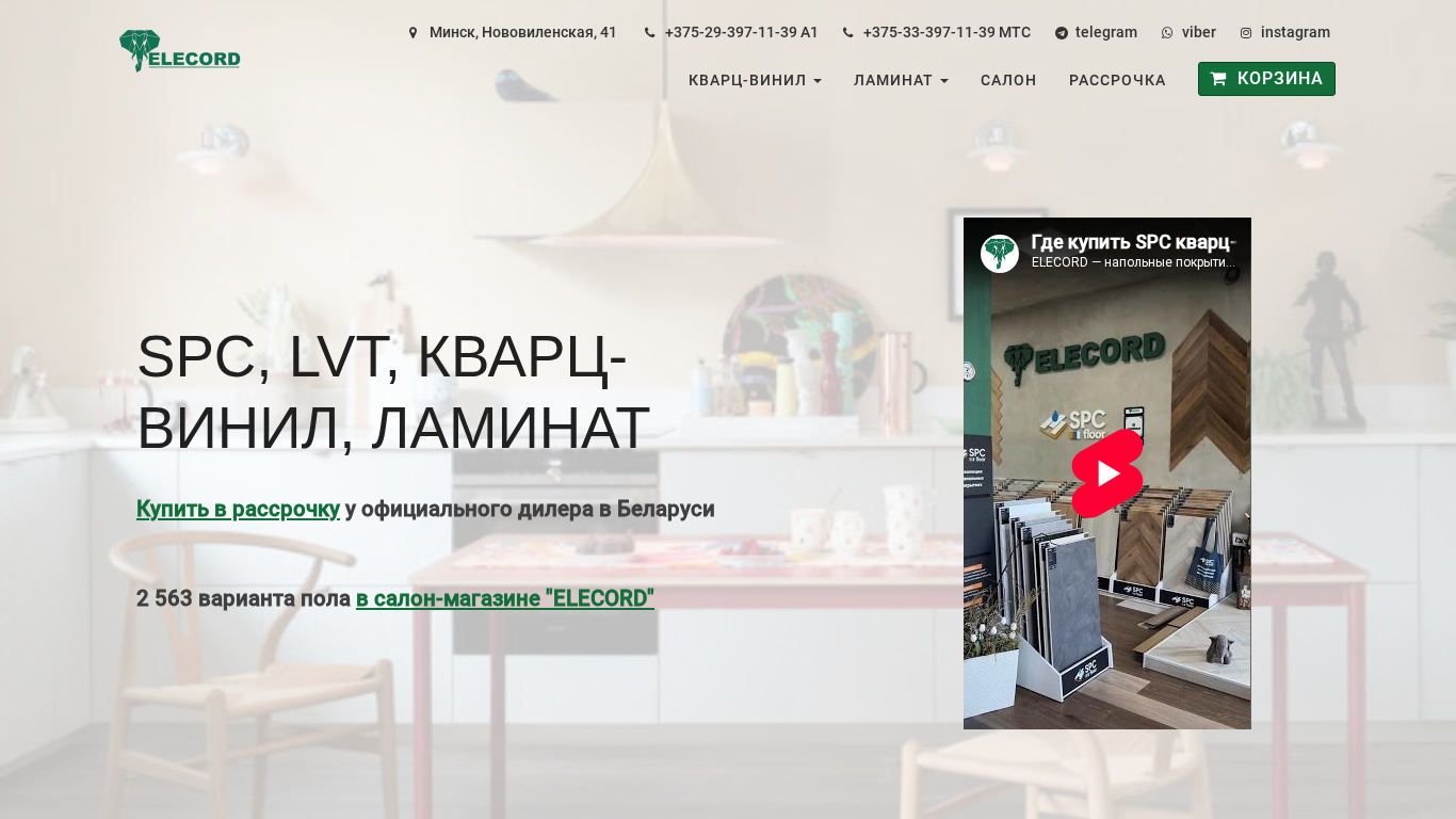 This website is a flooring salon-store named ELECORD, located in Minsk, Belarus, at the address Нововиленская, 41. The store specializes in selling and installing various types of flooring, including quartz vinyl and laminate. The top keywords for this website are "floor," "order," "elecord," "payment," and "carpet." The most frequently used words are "price," "floor," "order," and "elecord." The website offers a wide range of flooring options and accessories, including brands like Meister Lindura, Invictus, Berry Alloc, and Alpine Floor. Customers can make purchases in installments and take advantage of discounts during the holiday season. The website also provides a catalog and contact information for the store, including phone numbers for A1 and MTS, and email address for