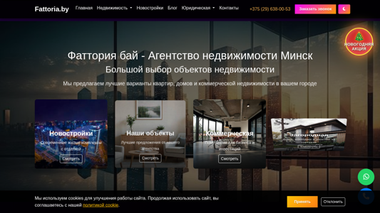 | AI-анализ | --- The portal Fattoria.by is an estate agency based in Minsk, Belarus. It offers sales and rentals of apartments, houses, and commercial properties, showcasing the best deals on the Belarusian real estate market. The site includes a test-drive service for property sales, allowing users to try the agency's services risk-free for 20 days, which includes a free property valuation, professional photography, placement on over ten advertising platforms, and a personal manager for the entire period. Users can leave their contact information for a call back. The agency also provides legal information and a blog. |