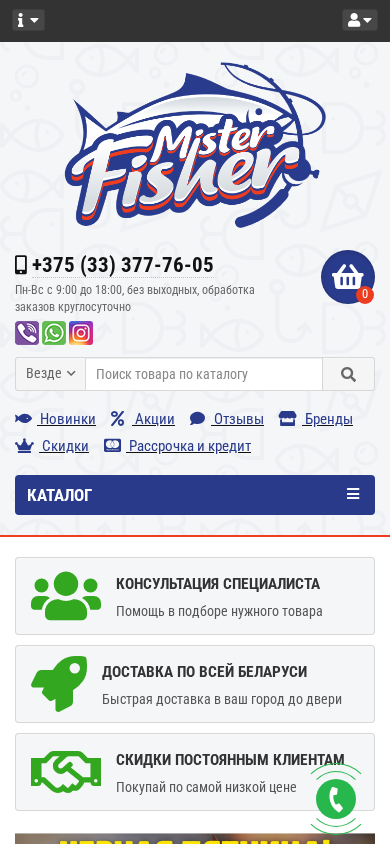 This website is an online fishing shop based in Grodno and Minsk, Belarus, named MisterFisher.by. It offers a wide range of fishing equipment for sale, including rods, reels, lines, hooks, baits, and accessories. Customers can browse product photos, read reviews, and check availability and prices. Delivery is available within Minsk and Belarus, and the website supports both wholesale and retail sales. Regular promotions, discounts, and special offers are announced on the site. The website features a personal cabinet for registration and authorization, as well as options for payment and delivery. It also includes a news section, a catalog of brands, and contact information.