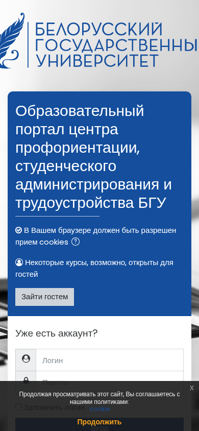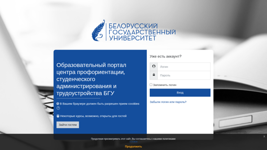| AI-анализ | language: ru The web project "Educational Portal of the Center for Career Orientation, Student Administration and Employment of BSU: Entrance to the Site" is a Russian-language educational platform of Belarusian State University (BSU) that requires acceptance of cookie policies for access. The site offers a login feature for users, and some courses may be accessible to guests. The title of the page is "Вход на сайт" (Entrance to the Site), and the description includes keywords related to the educational portal, student administration, and employment services at BSU. Top words on the page include "логин" (login), "образовательный" (educational), "портал" (portal), "центра" (center), "профориентации" (career orientation), "студенческого" (student), "администрирования |