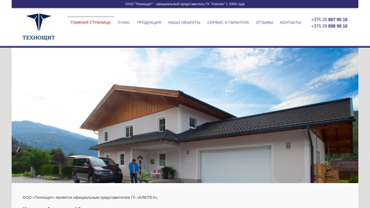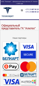This website is the official representative of GK "Aлютех" by OOO "Технощит" - the official representative of GK "Алютех" since 2009. OOO "Технощит" offers sales and installation of gates, rollers, lifting equipment, and metal structures. The company's main page includes information about the company, products, projects, service, and customer reviews, along with contacts and a phone number. The team consists of certified specialists and installers. Since 2002, over 1,000 satisfied clients include major brands like "Белавиа," "БелАЗ," "Беларуськалий," "Белоруснефть," "МАЗ," "АМКОДОР," "Верховный суд Республики Бела