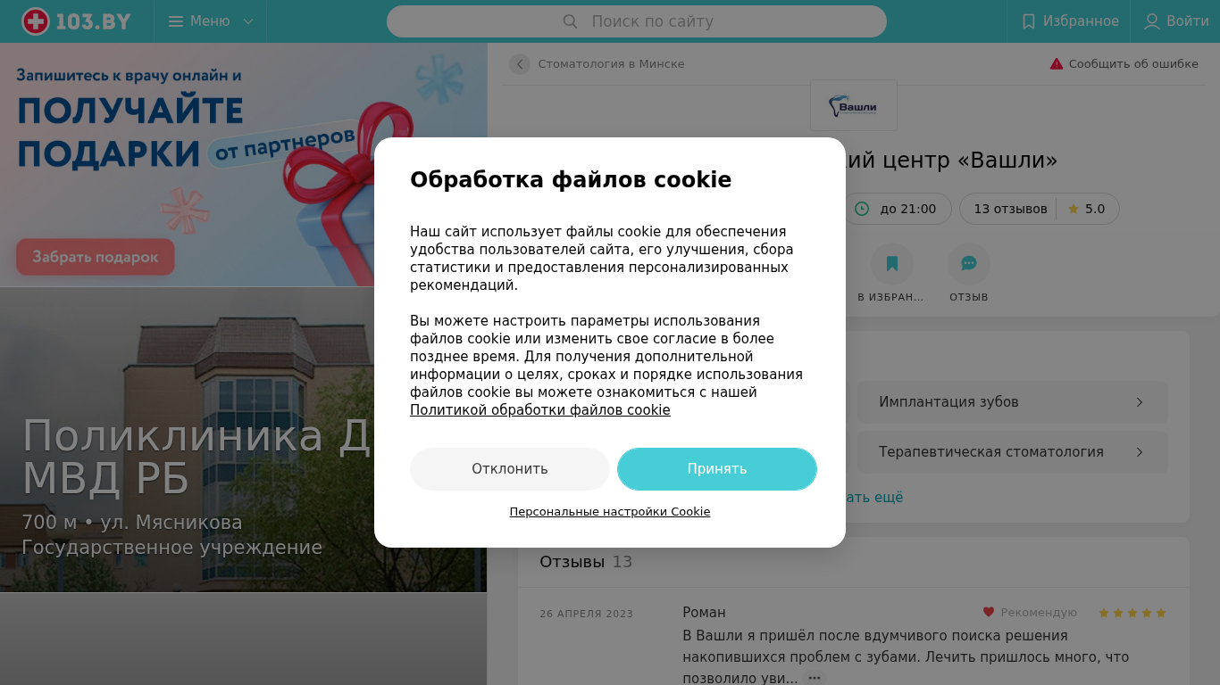 | AI-анализ | The website vashli.103.by is for a dental clinic named 'Вашли' located at ul. Революционная 4 in Minsk, Belarus. The website provides contact information including phone numbers and operating hours, as well as the option to make an appointment. It also features reviews from patients. The top services offered at the clinic are aesthetic dentistry, therapeutic dentistry, tooth whitening, and implantation of teeth. The website also mentions services related to sterilization of medical instruments. The domain is registered under the .BY top-level domain and belongs to the 103.by medical portal. The website has a user-friendly interface with a menu for site search, favorites, login, and a section for dentistry in Minsk. It also has a section for reporting errors. The website displays 13 patient reviews with an average |