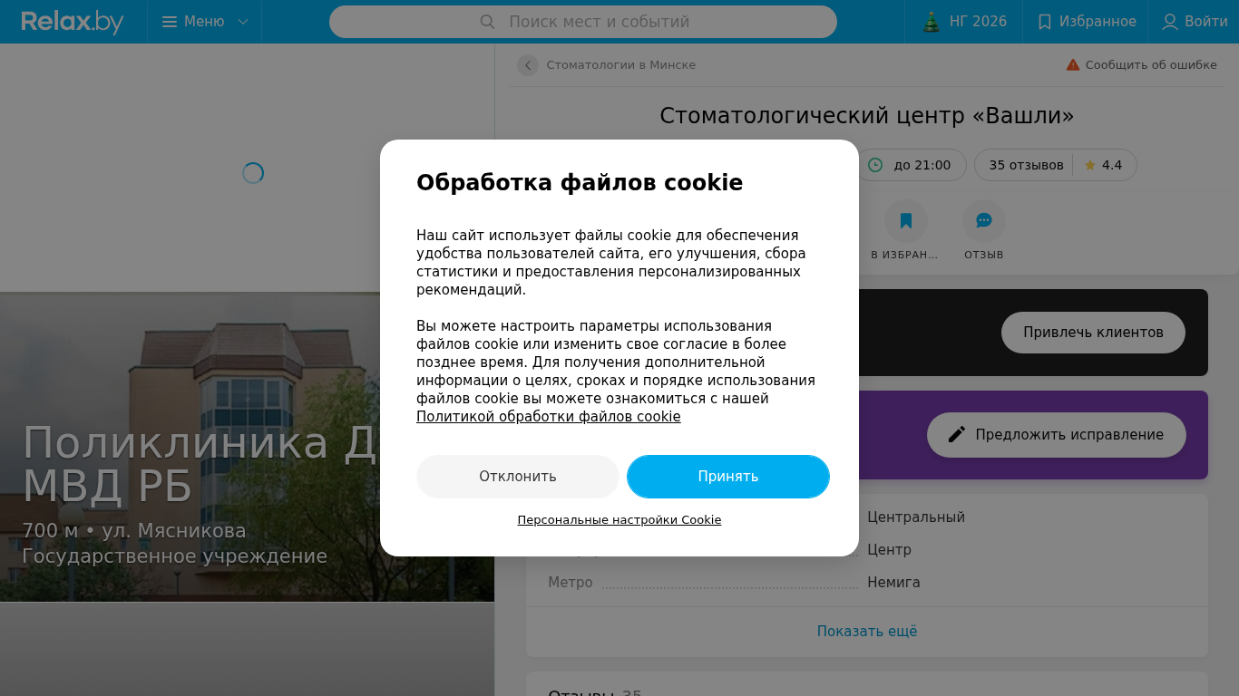 | AI-анализ | language: ru country_code: BY The web project "Stoomatalogy Center Vashli in Minsk, Revolutsionnaya 4 – Reviews, Addresses and Telephones" provides information about the dental clinic Vashli in Minsk, Belarus. The project includes reviews, contact information, working hours, and a map for visitors. Keywords associated with the website include 'stomatology', 'Vashli', 'Minsk', and 'centre'. The top words on the website are 'stomatology', 'cookie', 'Vashli', 'services', 'centre', and 'Minsk'. The website has had 35 reviews with an average rating of 4.4. The clinic is located in the Central district of Minsk, near the metro station Nemiga. The website also lists nearby dental clinics and their distances |