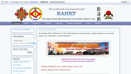 | AI-анализ | The website "МСК "Канку" (kanku-club.blogspot.com.by) is a blog dedicated to the youth sports club Канку in Belarus, focusing on shotoikan karate-do. The site provides information about various competitions and tournaments, with detailed results and photos. Key topics include sanbon kumite, katas, shobu ippon kumite, and lepestki. Upcoming events include the II Республиканские юношеские соревнования по шотокан каратэ-до on November 26, 2023, in Ivanovo, and the 25-е открытые региональные соревнования по шотокан каратэ-до "Осенний дебют-2023" on October 29, 202 |