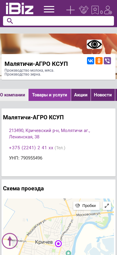 | AI-анализ | The web project "Малятичи-АГРО КСУП" is a Belarusian agricultural enterprise specializing in the production of milk, meat, and grains, as indicated by its title and description. The company's address is listed as 213490, Молятичи аг., Ленинская, 38. The site includes sections for company information, products and services, and announcements for sales and purchases. The contact information provided is a phone number, +375 (2241) 2 41 xx (Тел.), and the Unified State Register number is 790955496. The company operates Monday to Friday from 9:00 to 18:00 without lunch breaks. There is also a map and directions to the company's location, as well as links to |