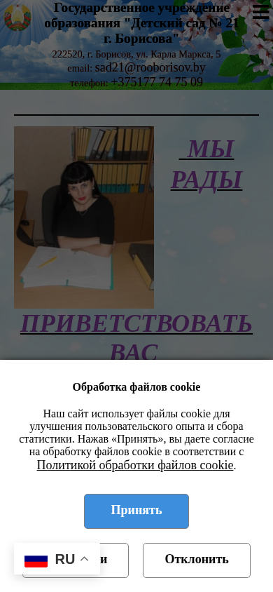 | Адрес | Официальный сайт, Государственное учреждение образования "Детский сад № 21 г. Борисова", 222520, г. Борисов, ул. Карла Маркса, 5 |