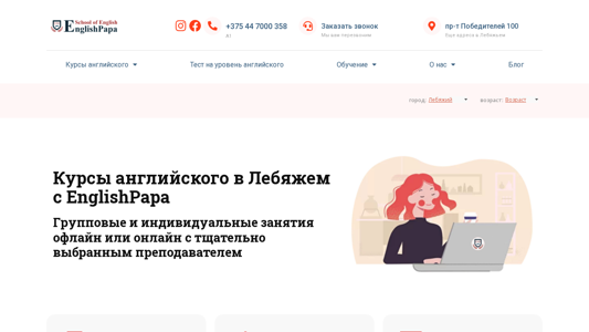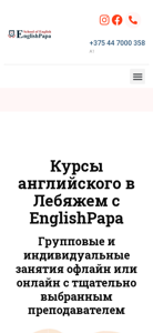 | AI-анализ | The website lebyazhy.englishpapa.by is dedicated to English language courses in Lebяжеm, Belarus. The site offers group and individual classes both offline and online, with carefully selected teachers. The courses cater to adults for career development, travel, and social interaction. Prospective students can leave a request for English language courses for children, corporations, and can take a free trial online lesson. The website contains sections on the teaching process, testimonials, FAQ, and information on the company, careers, contacts, and franchising. The site also features a blog. The age groups served are 10-12, 13-16, and 18 and above. The cities served include but are not limited to, Minsk, Brest, Grodno, Goмель, Витебск, Могилев, Мозырь, Баранови |