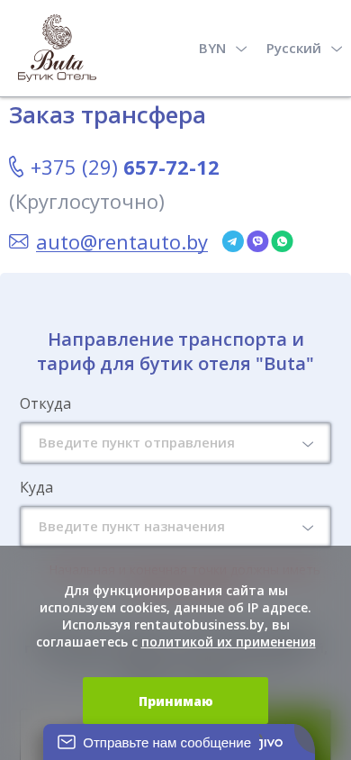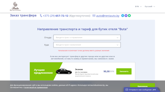 | AI-анализ | --- The portal is a transport booking service for the Belarusian market, focusing on the "Buta" hotel chain. It offers transfers to and from hotels, the airport, and the train station, with various vehicle classes and seating capacities. The available classes range from economy (Skoda Rapid, Hyundai Accent) to business (Toyota Camry, Skoda Superb), and from minibuses for up to eight passengers (Mercedes-Benz Vito) to larger buses for up to 21 passengers (Mercedes-Benz Sprinter). Users can specify their pick-up and drop-off locations, choose a date and time, and indicate the number of passengers and luggage. The service also allows users to cancel their reservations without a fee up to two hours before the scheduled trip. The website provides information on fares for each vehicle type and route. |