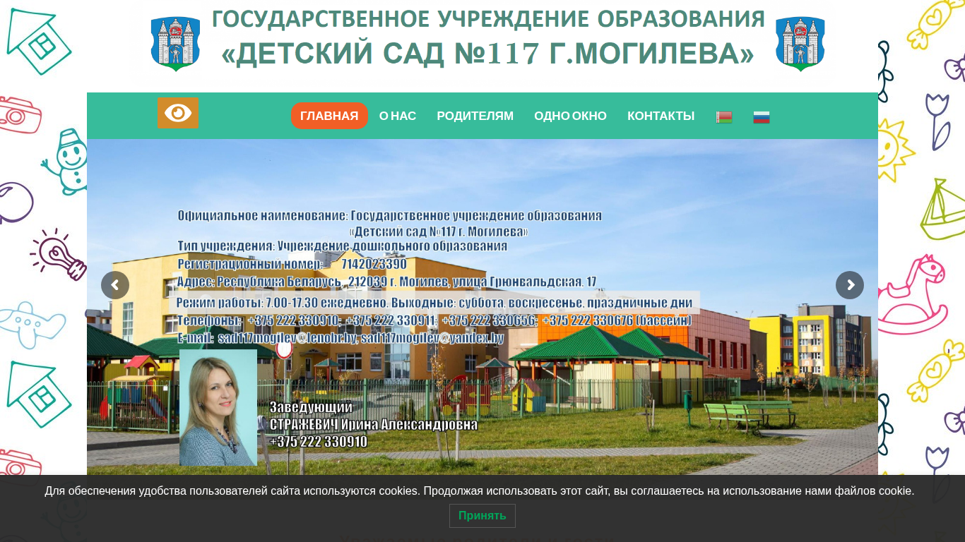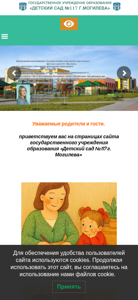 | AI-анализ | The website "Детский сад №117 г. Могилева" (Sad 117 Mogilev) is the official site of the kindergarten "Детский сад №117 г. Могилева" (Children's Kindergarten No. 117 in Mogilev, Belarus). The site provides information about the kindergarten, its history, traditions, achievements, and various educational and support programs. It includes sections on licensing, goals and objectives, legal framework, admission, leadership, special education, counseling, and policies regarding personal data protection. The site also features information on the summer program, meals, safety, resources, and civic and patriotic education. Additionally, there are sections on the opening of private kindergartens, short-term care for future first-graders, the parent's council, |