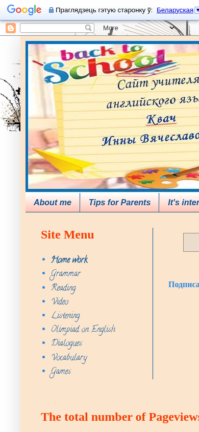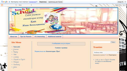 | AI-анализ | The website "Mybloginnakvach.blogspot.com.by" is titled "Английский язык" and is primarily about the English language. Keywords associated with the site include 'english', 'language', 'tips', 'parents', and 'grammar'. The site contains pages about 'About me', 'Tips for Parents', and 'Additional material'. The menu includes sections for 'Home', 'work', 'Grammar', and 'Reading'. The site offers video, listening, olimpiad, dialogues, vocabulary games, and links to other English language websites. No messages are present on the site. The site is built using Blogger technology. |
