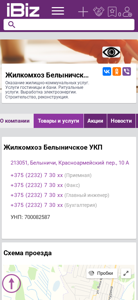 | AI-анализ | The portal Жилкомхоз Белыничское УКП offers a range of services including residential and communal services, hotel and spa facilities, and ritual services. Additionally, the company produces electricity and offers construction and reconstruction services. The address is Красноармейский пер., 10 А, in Белыничи, 213051. Contact numbers include +375 (2232) 7 30 xx (reception), +375 (2232) 7 30 xx (fax), +375 (2232) 7 30 xx (chief engineer), and +375 (2232) 7 30 xx (accounting). Business hours are 08:00 - 17:00 with lunch breaks from 13: |