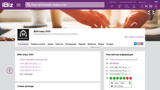 | AI-анализ | The web project "ВНН плюс ООО" offers ritual goods and services, as well as cemetery improvement. The company's location is given as 213051, Белыничи, Советская, 23А. The site includes a map for directions, contact phone numbers, and the company's Unified State Register number. The business hours are listed as Monday through Friday, 10:00 AM to 6:00 PM, with no lunch break. The site also features sections for news, announcements, vacancies, and customer reviews on social media platforms. Services include ritual services and occasional sales or promotions. The company name is "ВНН плюс ООО" and its phone numbers are +375 (44) 791 18 xx, +375 (29) 3 |