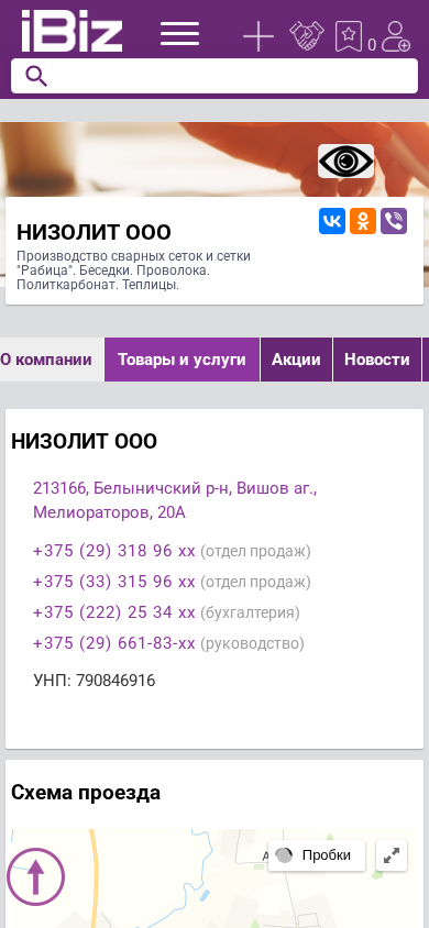 | Название / Заголовок | НИЗОЛИТ ООО - Производство сварных сеток и сетки "Рабица". Беседки. Проволока. Политкарбонат. Теплицы.. 213166, , Вишов аг., Мелиораторов, 20А |