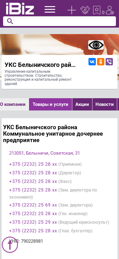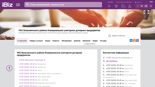 | AI-анализ | The portal is a website for the communal enterprise under the subordination of the Belarusian district of Belynichi, named 'УКС Белыничского района Коммунальное унитарное доchернее predprijatie - Управление капитальным стroyitelstvom.' The main activities of the enterprise include construction, reconstruction, and major repairs of buildings. The website provides information on the company, its products and services, as well as contact details, including phone numbers and addresses for various departments. It also includes a section for job vacancies and company news. The website can be accessed at uks-bel.ibiz.by and is open for public visit from Monday to Friday, 9:00 AM to 6:00 PM, except for lunch hours. The company director is Andrey Petrovich Yeroshenko. |