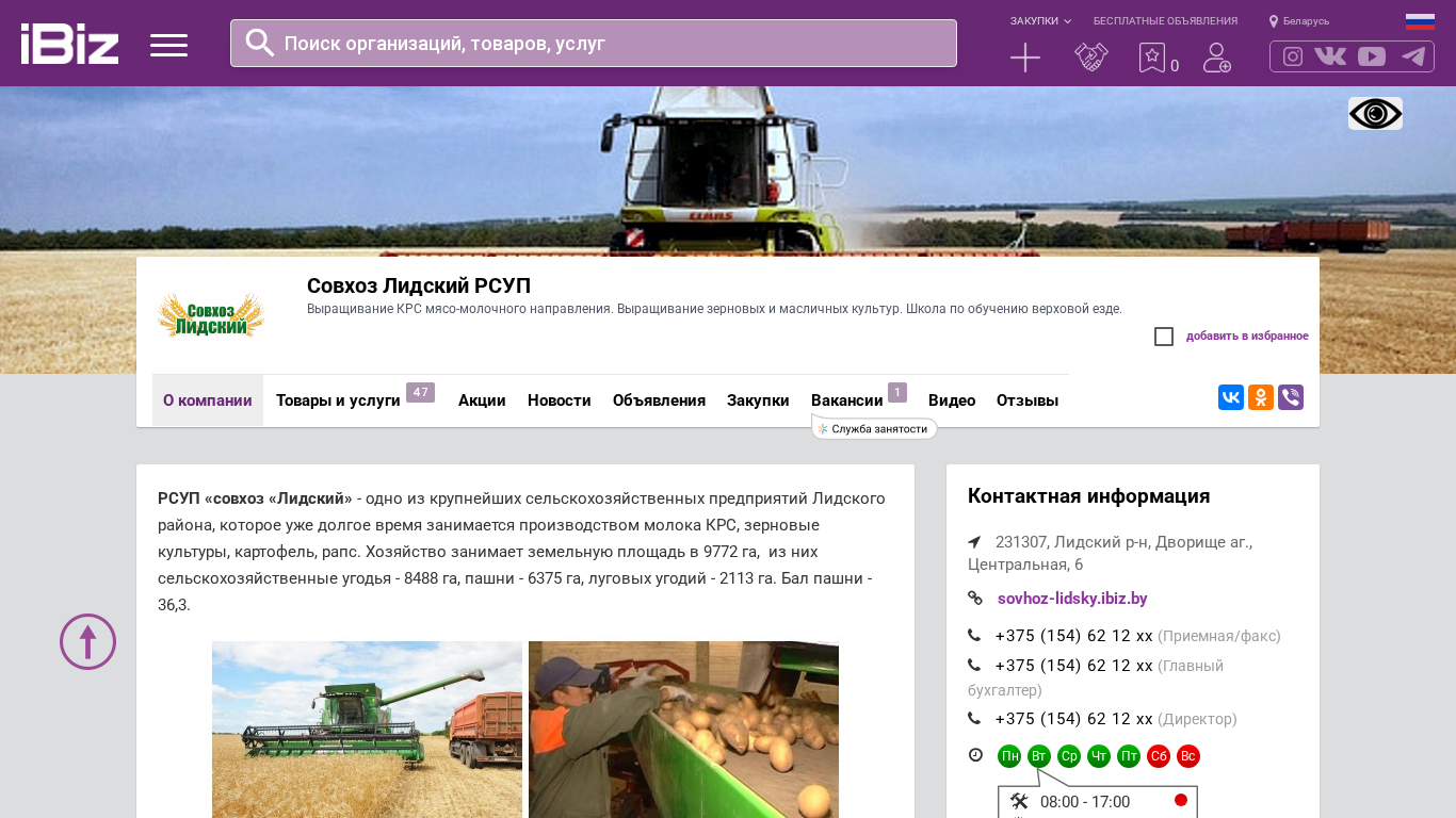 | AI-анализ | The portal Sovhoz Lidsky RSUP is a farming collective that specializes in milk and meat cattle production, as well as cultivation of grains and oilseeds. It also features a riding school. The organization is located in Dvorishche, ag., Centralnaia, 6 in the 231307 postal code area. The farming estate covers 9772 ha of land, with agricultural areas accounting for 8488 ha, 6375 ha of arable land, and 2113 ha of meadows. The farm produces and sells beef, milk, grains, and oilseeds. It also offers riding lessons with two well-equipped horse stables. The farm includes two repair workshops, three grain storage facilities, three potato storage facilities, two fuel storage facilities, a central warehouse, a pilora, four combined grain |