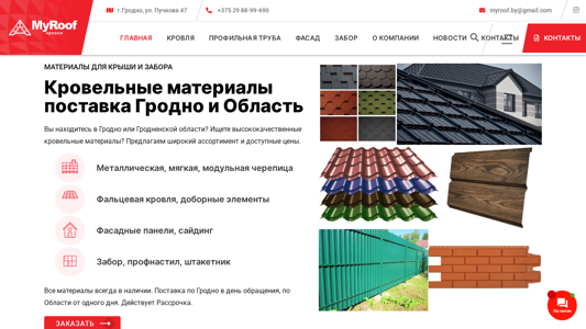 | SEO-описание | Кровельные материалы поставка по Гродно и Области. Доставим, проконсультируем, при необходимости смонтируем кровлю. |