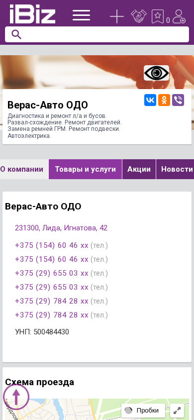| Название / Заголовок | Верас-Авто ОДО - Диагностика и ремонт л/а и бусов. Развал-схождение. Ремонт двигателей. Замена ремней ГРМ. Ремонт подвески. Автоэлектрика.. 231300, Лида, , Игнатова, 42 |