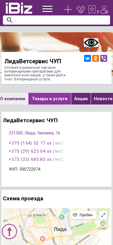 | AI-анализ | The portal LidaVetservis CHUP is a retail and wholesale trading platform for veterinary medicines for various animals, fish and bees, along with veterinary services. The company is located in Lida, Belarus, at Чапаева Street 16. The contact numbers for the company are +375 (154) 52 77 xx, +375 (29) 625 04 xx, and +375 (33) 685 83 xx. The company offers veterinary products and services, including production and sales, as well as animal care. The business hours are from 9:00 to 18:00, Monday to Friday, with weekends being a day off. The company can be found in the categories of Veterinary Products - Production, Sales in Lida and |
