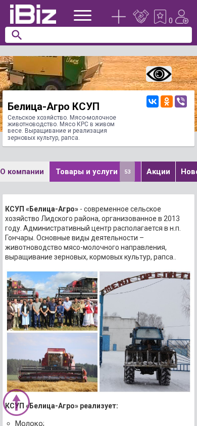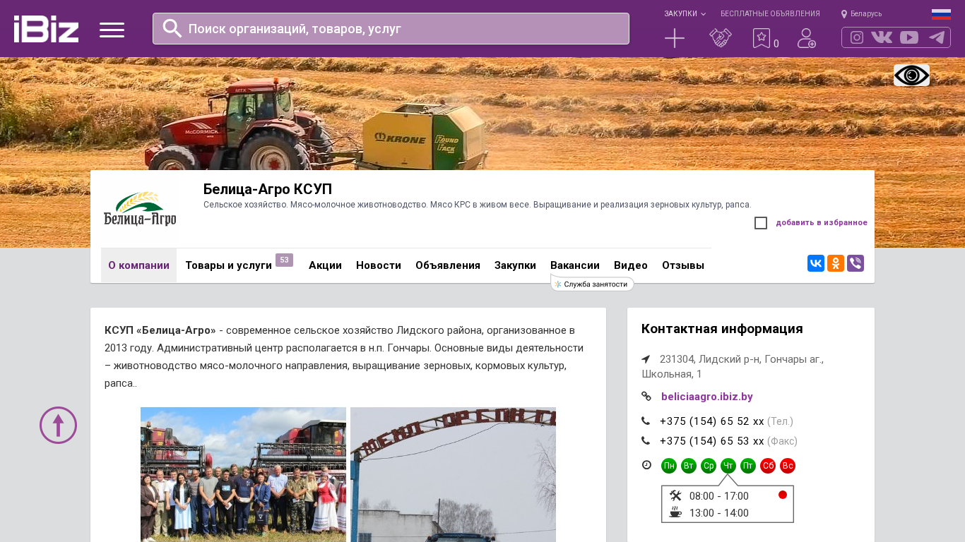 | AI-анализ | The website Beliciaagro.ibiz.by is dedicated to Belica-Agrro KSUP, a farming enterprise specializing in livestock farming for meat and dairy production, as well as cultivation and sale of zernovykh (grain) cultures, including rapsa (rapeseed). The company, established in 2013, is located in the village of Gonchary, in the Lidsky district of Belarus. The farm consists of two production sites, seven livestock farms, with five of them being MTFs (mechanized farming units), workshops, and zernosushilnye kompleksy (grain drying complexes) for primary grain processing. The farm owns 7411 hectares of agricultural land, with 4959 hectares used for cultivation and 245 |