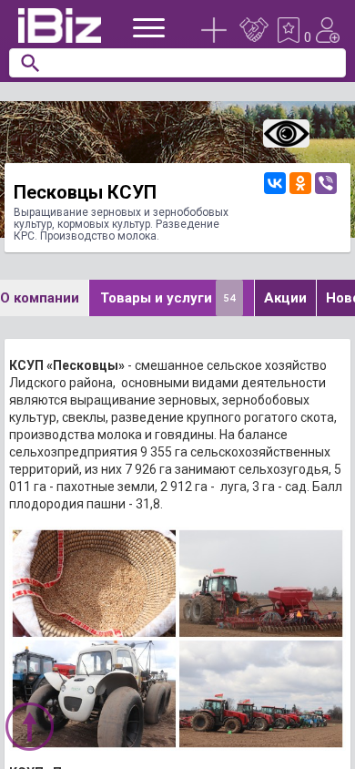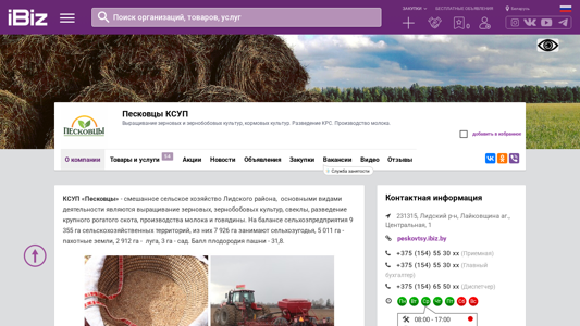| AI-анализ | The website is a Belarusian agricultural cooperative, named "Peskovtsy KSUP," which specializes in the cultivation of cereal and legume crops, as well as vegetable sugar beets. The cooperative also engages in livestock farming, producing milk and livestock. The website provides information on the company's location, which is in the Laikovshchina agricultural community, Centralna Street, number 1. The cooperative operates on 9,355 hectares of agricultural land, with 7,926 hectares dedicated to arable land, 5,011 hectares for pasture, and 2,912 hectares for meadows. The land's fertility index is 31.8. Peskovtsy KSUP offers various agricultural products such as grains, legumes, sugar |