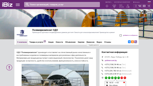 | AI-анализ | This online resource is a business website for "Полимеркомпозит ОДО," a company based in Lida, Belarus, specializing in the production and repair of group and individual shelters for livestock, as well as tanks for agricultural spraying equipment. The company's offerings include both new and repaired items. The site features a map and contact information. Keywords associated with the website include "production," "livestock," "agriculture," "repair," and "Belarus." |