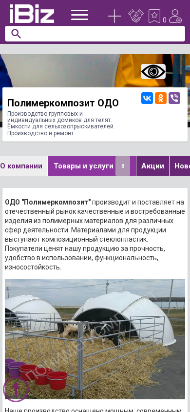 | Название / Заголовок | Полимеркомпозит ОДО - Производство групповых и индивидуальных домиков для телят. Ёмкости для сельхозопрыскивателей. Производство и ремонт.. 231291, Лида, , Победы пр-т, 30 |