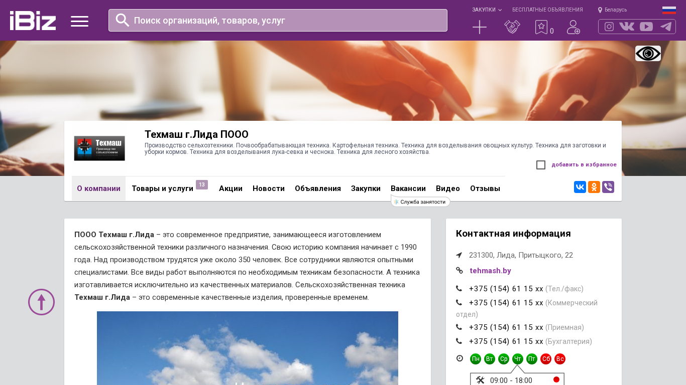 Название / ЗаголовокТехмаш г.Лида ПООО - Производство сельхозтехники. Почвообрабатывающая техника. Картофельная техника. Техника для возделывания овощных культур. Техника для заготовки и уборки кормов. Техника для возделывания лука-севка и чеснока. Техника для лесного хозяйства.. 231300, Лида, , Притыцкого, 22