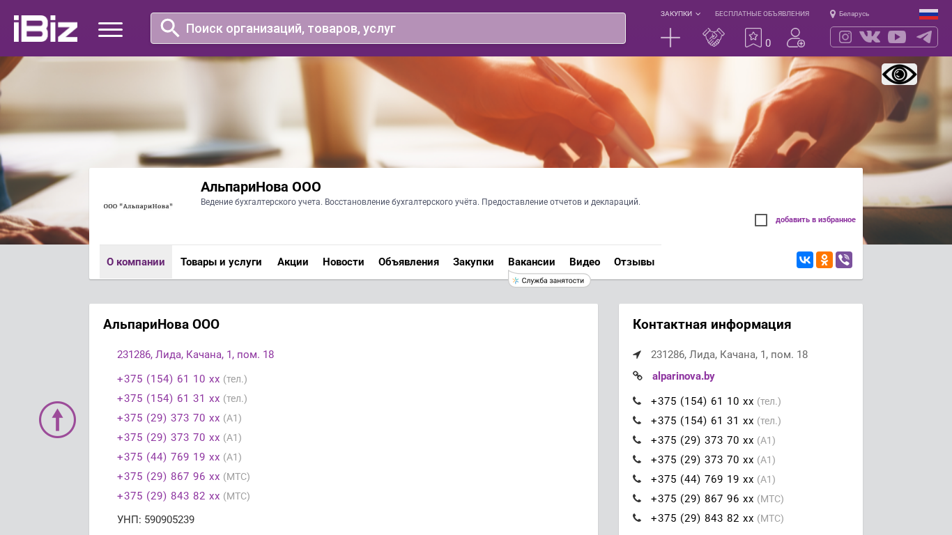 Название / ЗаголовокАльпариНова ООО - Ведение бухгалтерского учета. Восстановление бухгалтерского учёта. Предоставление отчетов и деклараций. . 231286, Лида, , Качана, 1, пом. 18