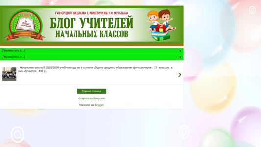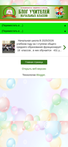 | AI-анализ | The website is a blog for primary school teachers, containing various pages such as 'Home' (or 'Main'), 'Teachers', 'Open Lessons Panorama', 'Materials', 'UMO Lesson', 'Shared Lessons', 'Out-of-class work', 'Week of primary classes', 'Business Style Wardrobe', 'Health Camp', 'Laboratory of Discoveries', and 'Clip' (presumably a video section). The blog features teachers sharing their lessons, materials, and out-of-class work, as well as a section for UMO (Understanding of Mathematics and Other Subjects) lessons. There is also a section dedicated to business style wardrobe and an ozdoroviтельный лагерь (ozdoroviтельный translates to 'health camp'). The blog appears to be using Blogger as its platform. The school has 18 |