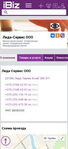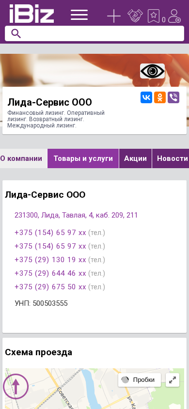 | AI-анализ | The website is for the Belarusian company 'Лида-Сервис ООО' that provides financing solutions including operational, return, and international leasing. The address and contact phone numbers are given as 231300, Лида, Тавлая, 4, каб. 209, 211. The website includes sections for company information, products and services, news, announcements, vacancies, videos, and reviews. The company specializes in various types of leasing such as real estate, automotive, equipment, furniture, and more. The operating hours are Monday to Friday from 9:00 AM to 6:00 PM without lunch breaks. The website can be found at lida-servis.ibiz.by. |
