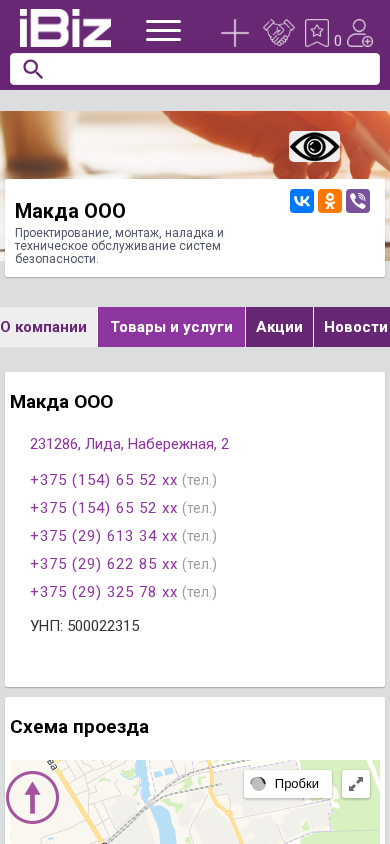 | AI-анализ | This website is for Макда ООО, a company based in Лида, Belarus, with the address Набережная, 2. The company specializes in designing, installing, commissioning, and providing technical support for security systems. The website includes contact information with multiple phone numbers: +375 (154) 65 52 xx, +375 (154) 65 52 xx, +375 (29) 613 34 xx, +375 (29) 622 85 xx, and +375 (29) 325 78 xx. The company identification number (УНП) is 500022315. The website also provides a map to help visitors locate the company. Business |