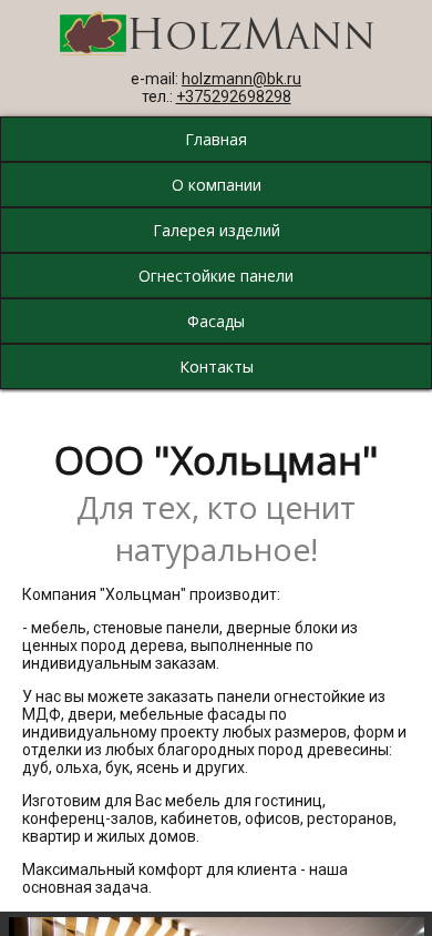 | AI-анализ | The portal holzmann.by is a company website for OOO "Хольцман," which specializes in manufacturing and selling furniture, fireproof panels, and door blocks from valuable tree species. The site offers custom-made fireproof MDF panels, doors, and furniture facades in various sizes, forms, and finishes. Customers can order furniture for hotels, conference rooms, offices, restaurants, apartments, and residential buildings. The company prioritizes maximum comfort for its clients. To order, clients can contact the company via email or phone, arrange for measurements at their home or office, receive a preliminary cost estimate, and have the furniture produced and delivered. OOO "Хольцман" is located in Belarus, Grodno region, Lidsky district, Tretiakovskoe settlement, and their contact information is provided on the site. |
